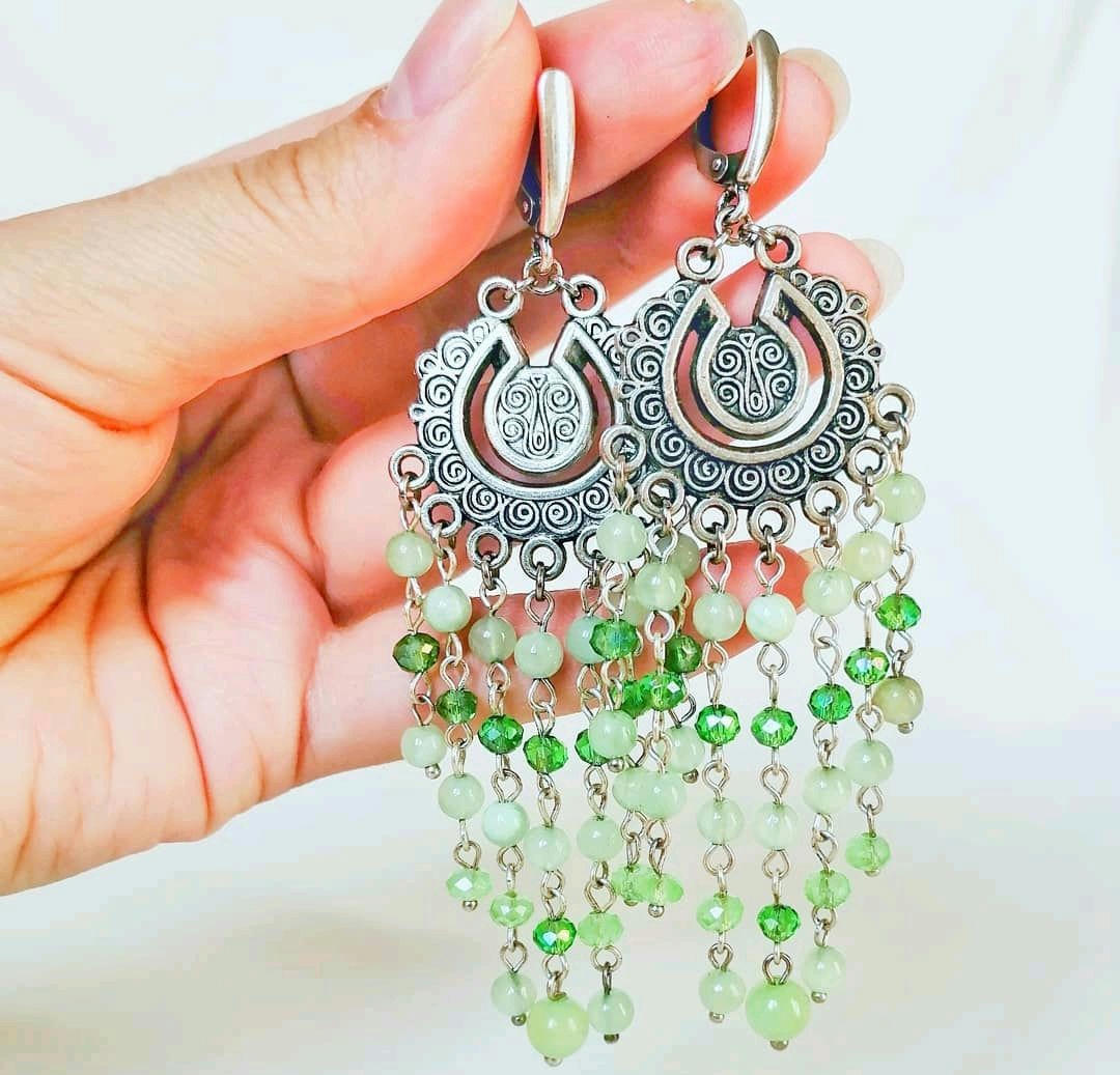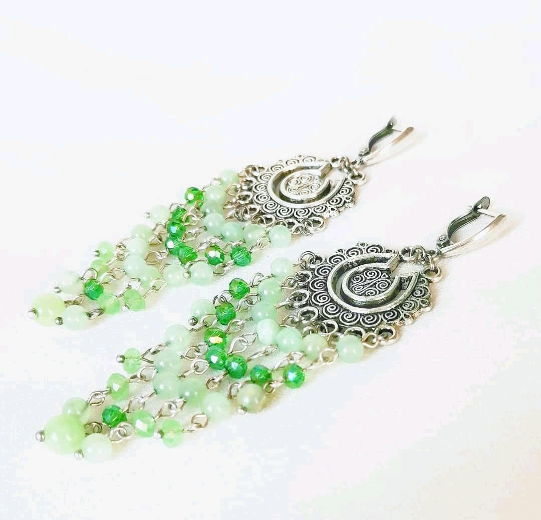 Длинные крупные серьги с натуральным камнем зеленый оникс в восточном стиле "Весенние".