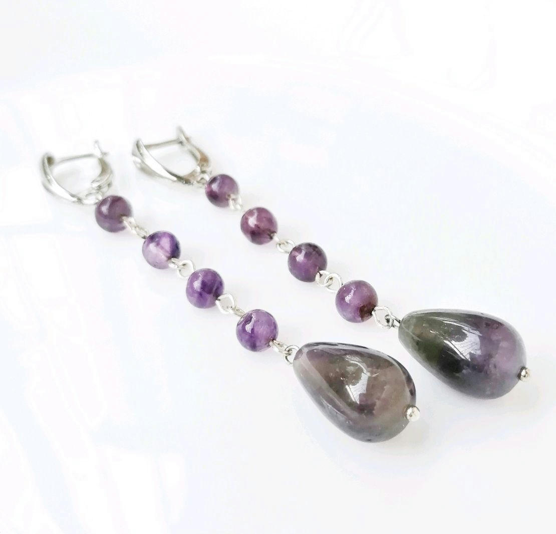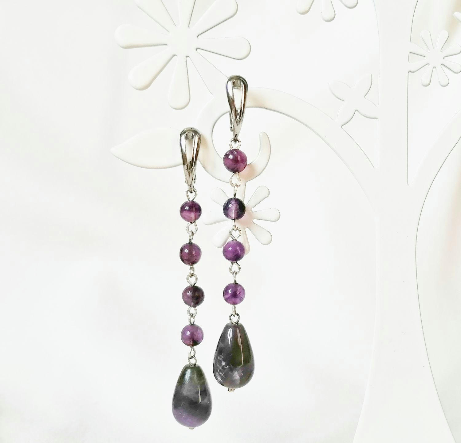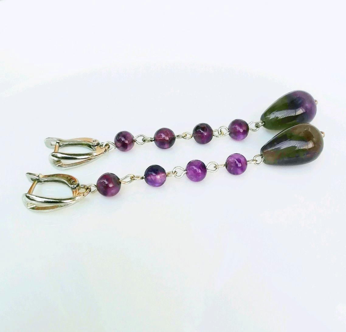 Длинные серьги капельки на цепочке с натуральным аметистом. Фурнитура премиум класса с родиевым покрытием.