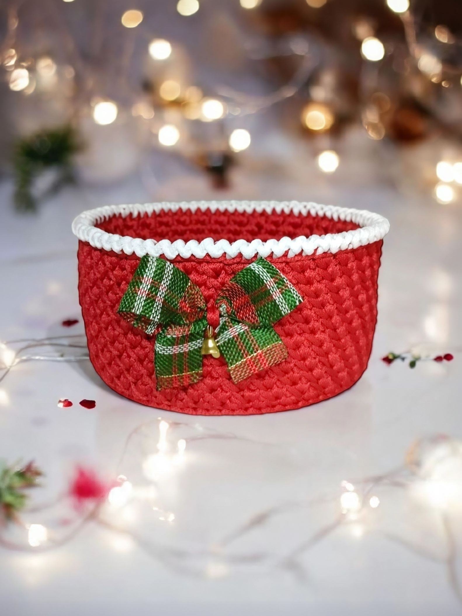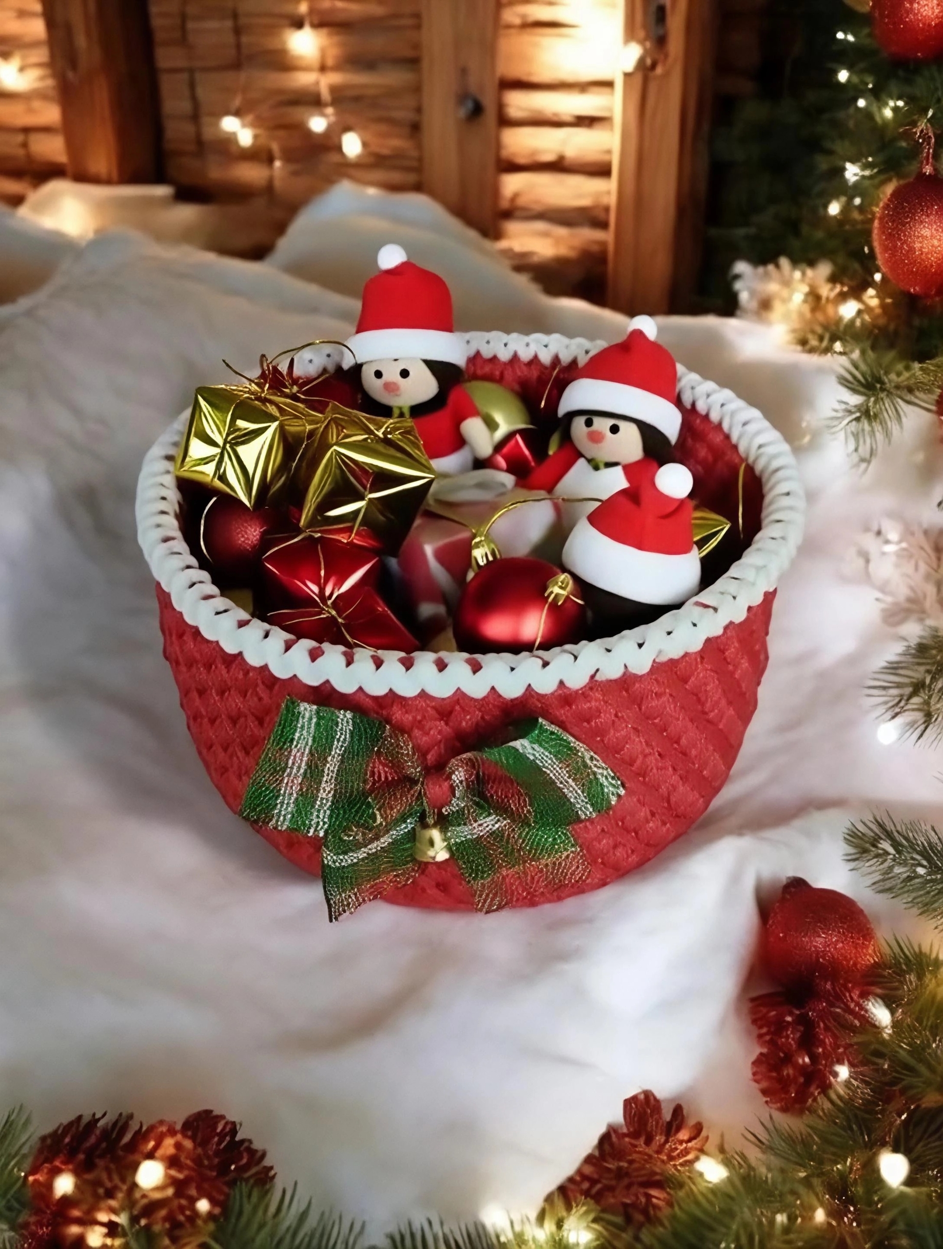 Создайте атмосферу настоящего рождественского чуда с авторской корзинкой ручной работы! Нежная вязка, тёплые красные тона и изящный бант превращают её в универсальный аксессуар для праздника.