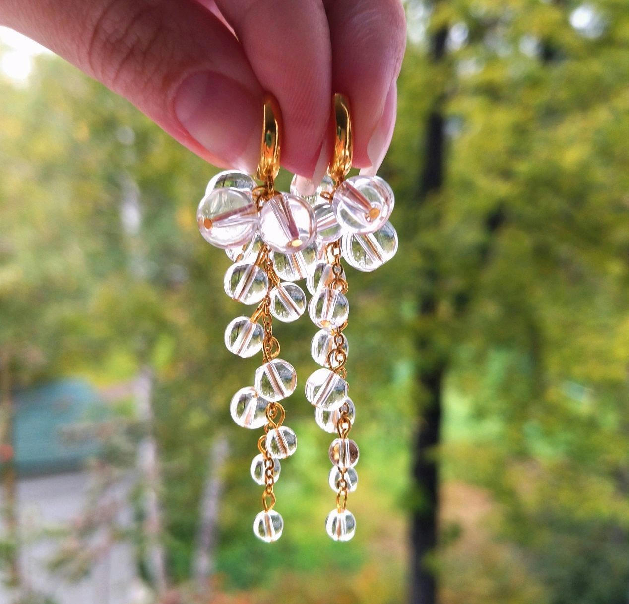 Бусины горного хрусталя своей прозрачностью напоминают капли росы. Очень легкие, нежные серьги.