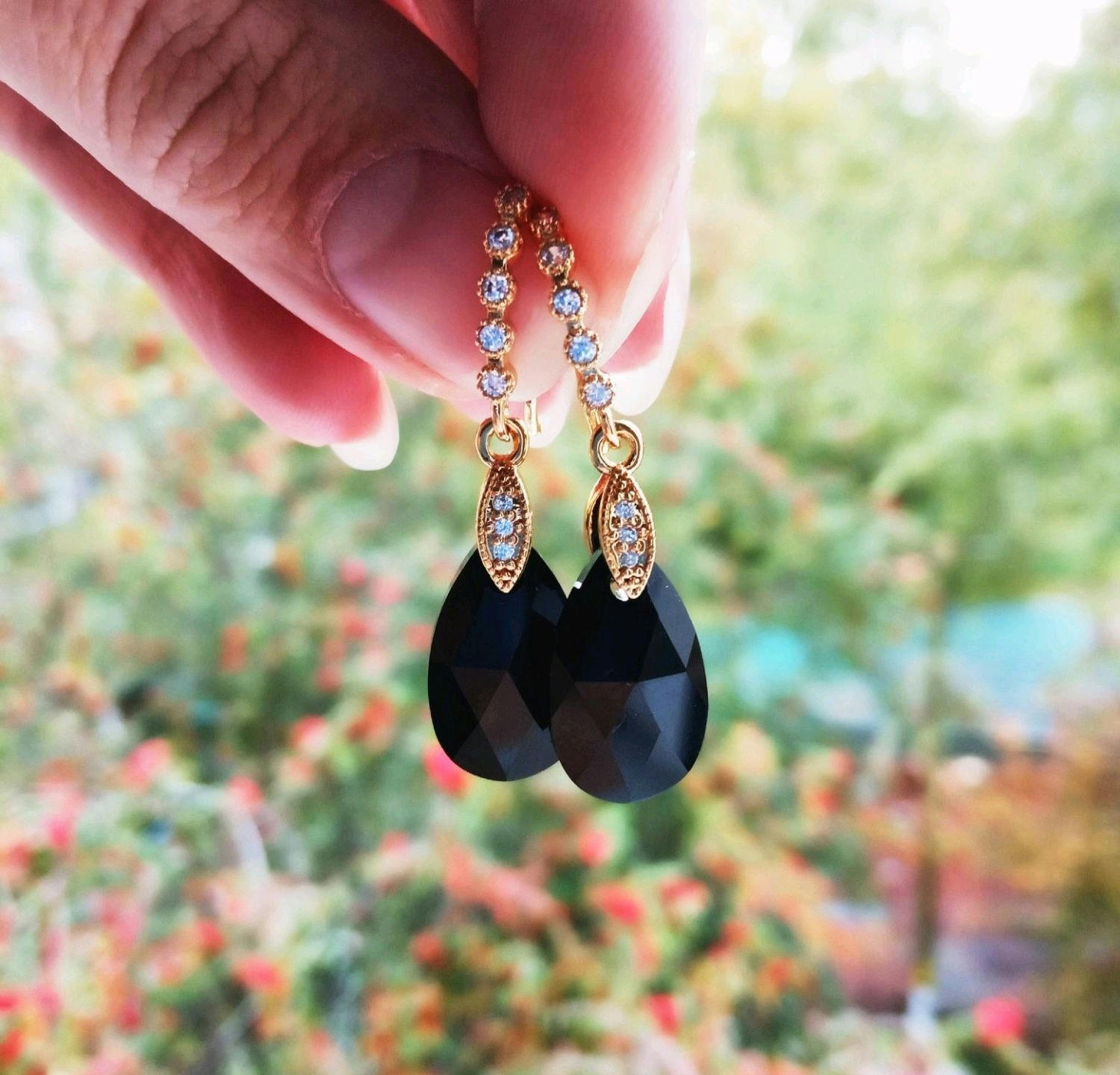 Золотые серьги капельки с кристаллами Сваровски чёрного цвета, инкрустированные фианитами - стильное и женственное украшение, которое идеально дополнит образ и добавит нежный акцент. Классические сережки с чёрным камнем предназначены как на каждый день, так и на вечер, на выпускной, на день рождение. Серьги с кристаллами в подарочной коробке подойдут в подарок для коллеги, жены, мамы, сестры! Элегантная женская бижутерия и аксессуары ручной работы - прекрасный подарок себе, родным и близким.