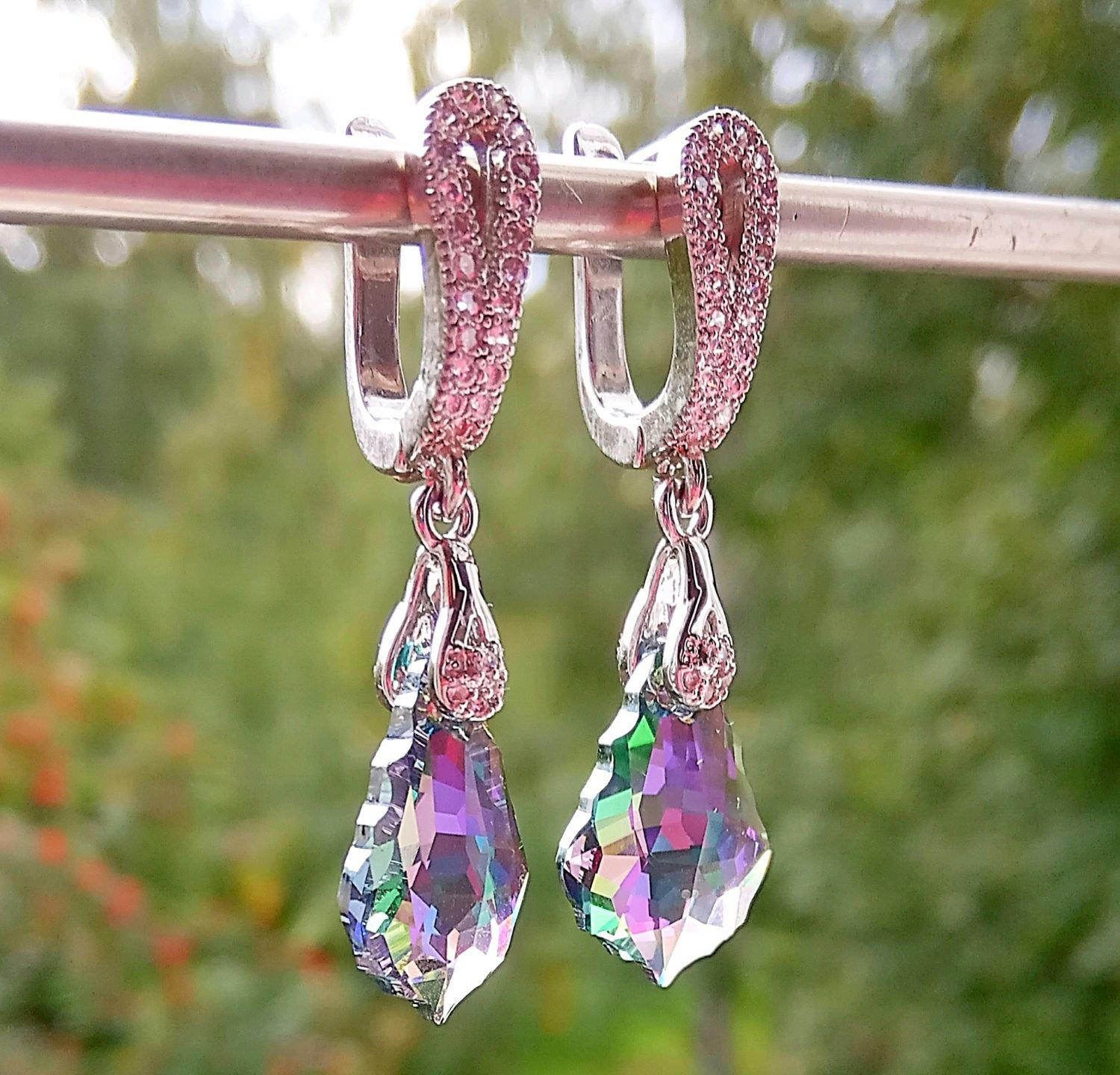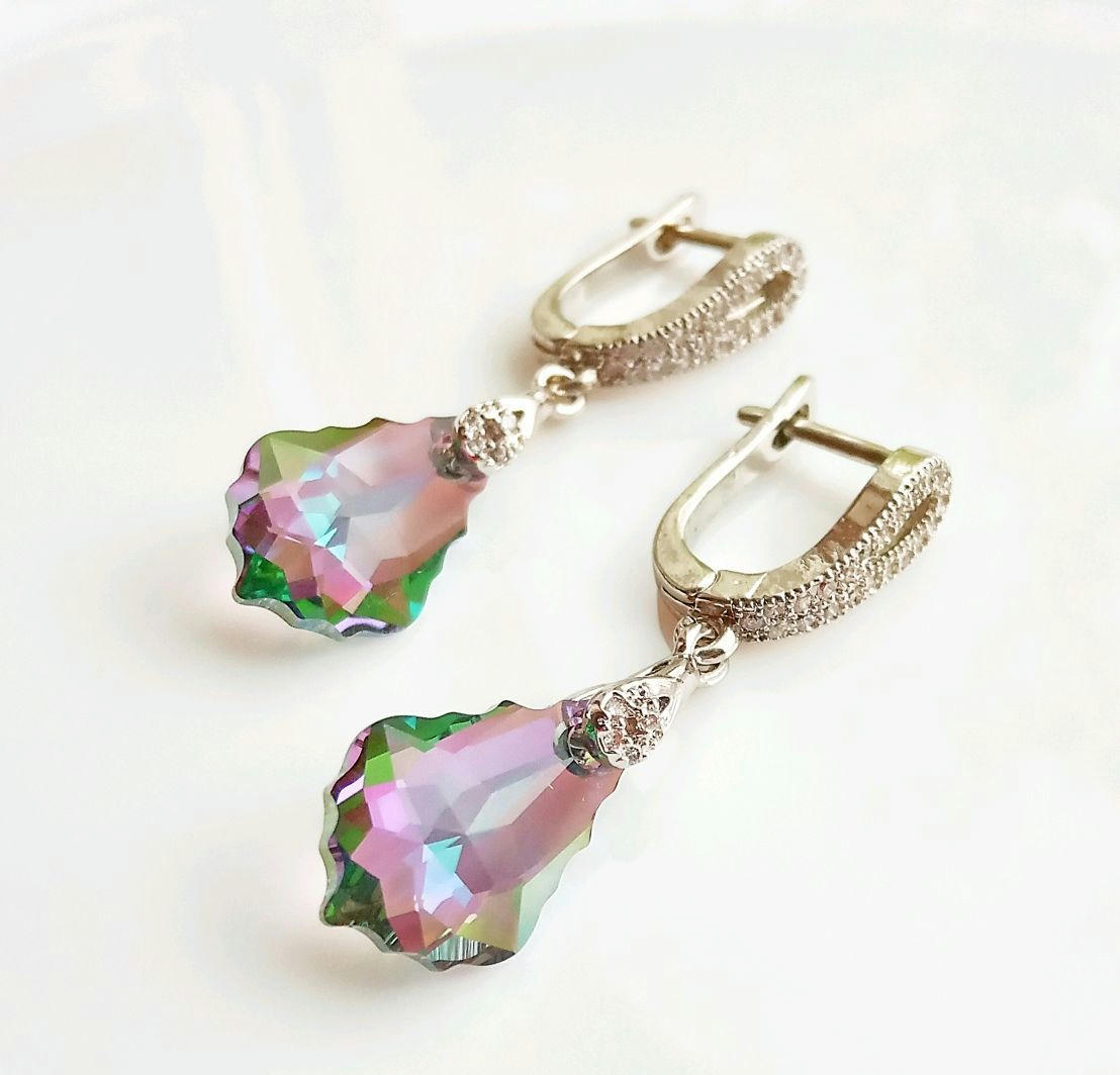Серьги с кристаллами Сваровски барокко красиво переливаются фиолетово-зеленым оттенком.